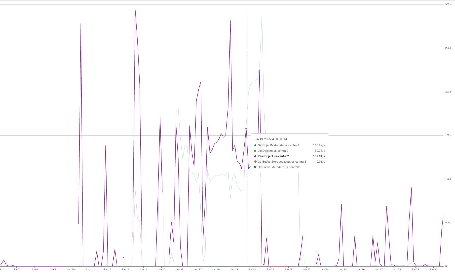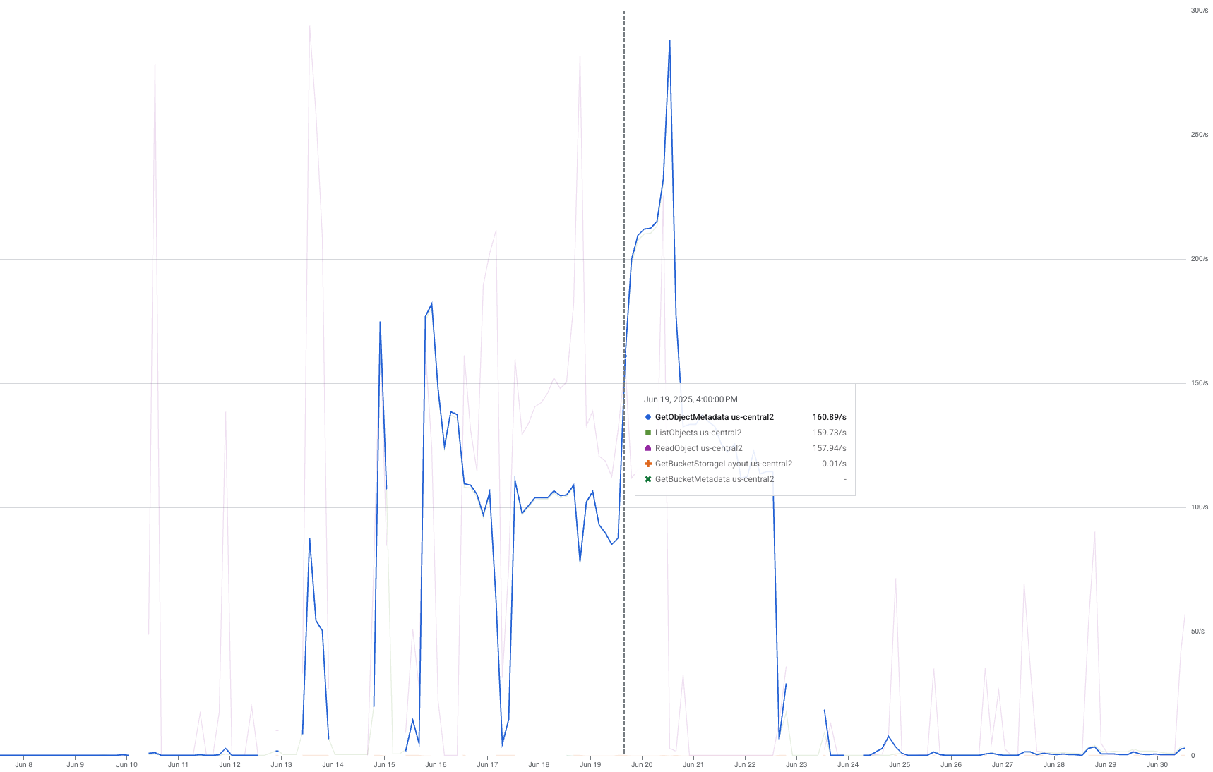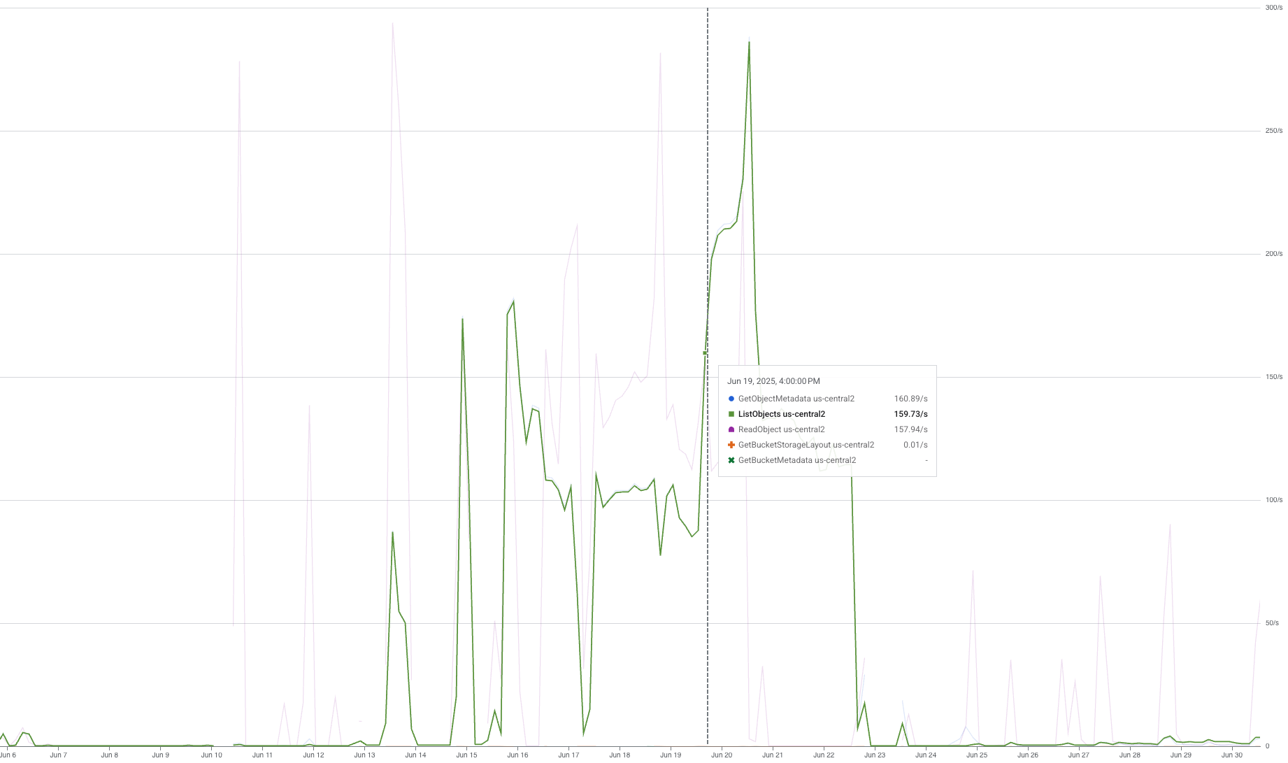 When we did a trial run using a single TPU pod, we got a $6.2 increase in “Regional Standard Class B Operations” and a spike of $38.75 in “Regional Standard Class A Operations”. Digging deeper into our usage graphs, we identified three spikes in ReadObject, GetObjectMetadata, and ListObjects requests: