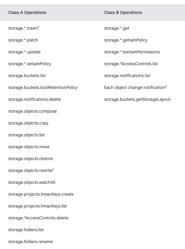 ReadObject is class B, GetObjectMetadata is also class B, explaining the double cost of “Regional Standard Class B Operations” from what we estimated, and ListObjects is Class A. Class A operations are primarily write operations and cost x12.5 more than Class B, resulting in the significant $38.75 in “Regional Standard Class A Operations”.